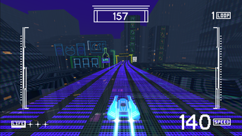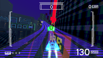 You pilot a supersonic ship in the heart of a cyberpunk mega-city.